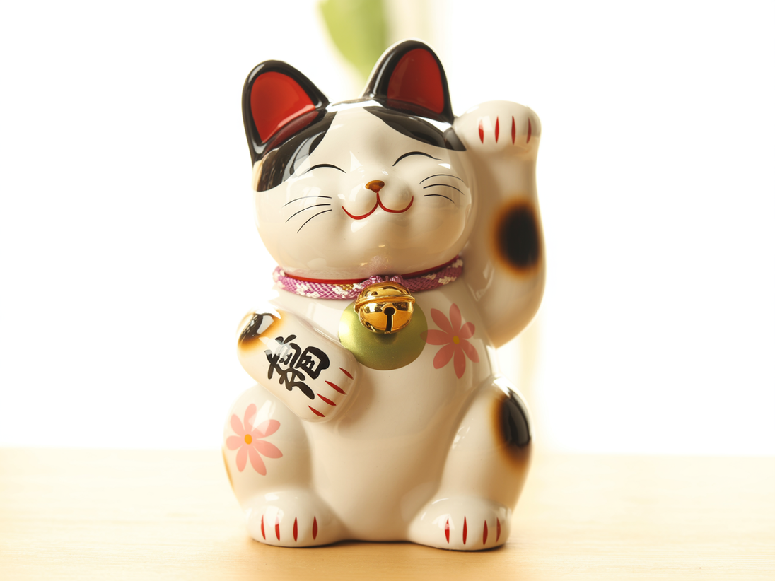 A porcelain cat happily waves its paws while sitting on a soft red cushion.
