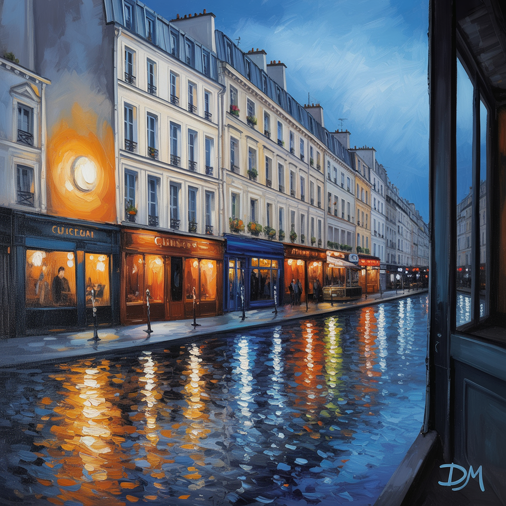 A vibrant oil painting of a Parisian street scene at dusk. The painting features traditional Haussmann-style buildings with cream-colored facades and dark gray roofs. The buildings have multiple floors with uniform windows and balconies. A warm orange-lit storefront with a glowing round light is on the left side. The street is lined with illuminated café lights and storefront windows creating a warm glow against the deep blue evening sky. The water in the foreground reflects the buildings and lights, creating a mirror-like effect with rich orange and golden reflections contrasting against the deep blue water. The painting has visible brushstrokes, particularly in the water reflection, giving it a textured, impressionistic quality. The composition is divided diagonally, with the buildings on the left and their reflections in the water on the right. The overall color palette consists of deep blues, warm oranges, cream whites, and dark grays.