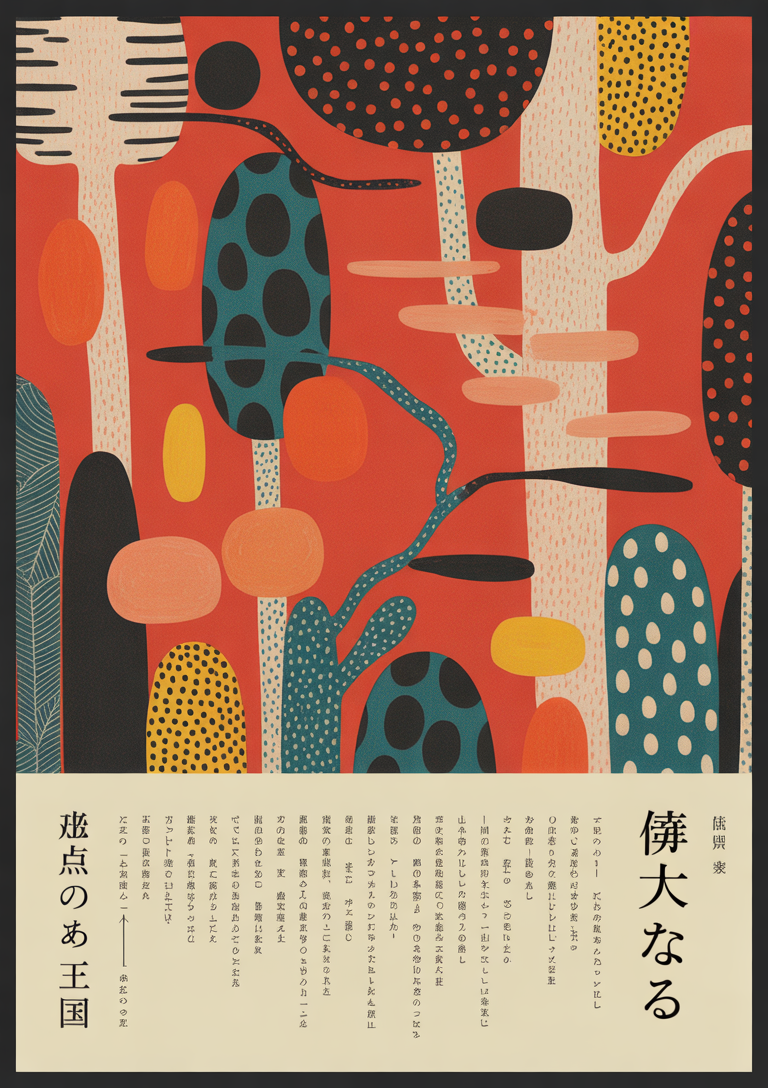 This Japanese poster is inspired by Japanese artist Yayoi Kusama. The poster captivates with its imaginative landscape depicting mushrooms of various shapes and colors against a bold red background. The rhythm of the dots and the intensity of the colors evoke a sense of movement and mystery, as if the magic of nature came to life.