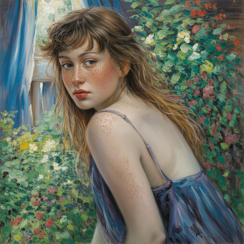 An oil painting of a young woman in a garden setting, painted in an impressionistic style with bold brushstrokes. The subject is shown from behind, looking over her shoulder at the viewer, with long wavy brown hair and freckles across her nose and cheeks. She wears a dark blue dress with thin straps. The background features vibrant green grass and foliage, with red flowers visible in the lower left corner. The painting has a rich, colorful palette with deep blues, bright greens, and warm yellows. The brushwork is loose and expressive, creating texture throughout the painting. The lighting in the piece is natural and soft, highlighting the subject's profile against the darker background. The painting style emphasizes movement and emotion through its dynamic brushwork and rich colors.